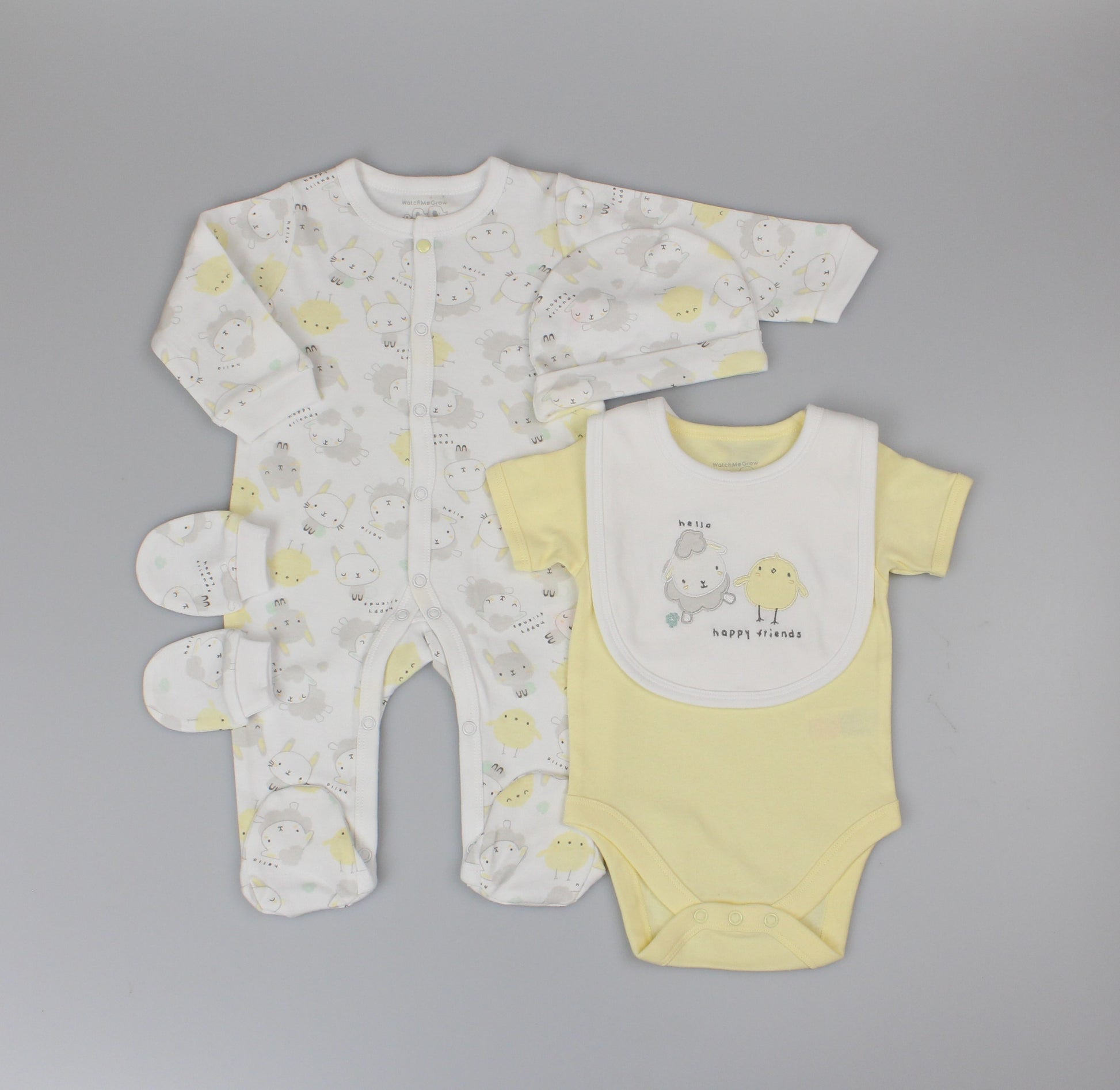 Set Includes: Bib, Hat, Sleepsuit, Bodyvest, Mittens, (presented in a mesh bag)