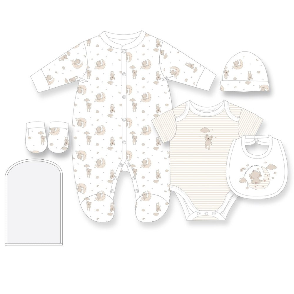 Set Includes: Sleepsuit, Bodyvest, Hat, Bib, Mittens & a Gift Bag