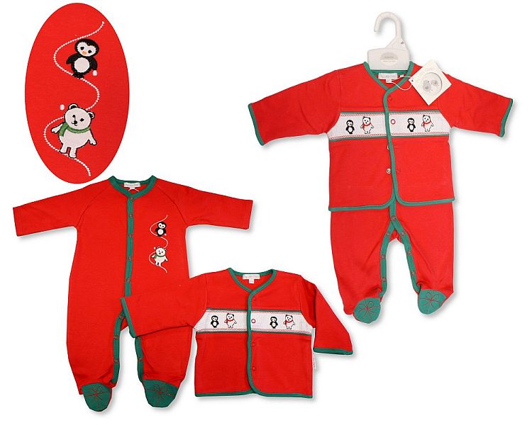 Baby Christmas Velour 2 pcs Set with Smocking - Polar Bear and Penguin (NB-6m) (PK6) BW-13-420