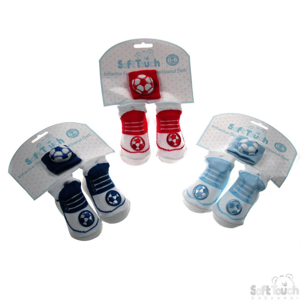 DESIGN/COLOUR 3 Assorted Colours w/Football Wristband & Football Boot Print Socks w/Football Patch: Light Blue, Red & Royal Blue