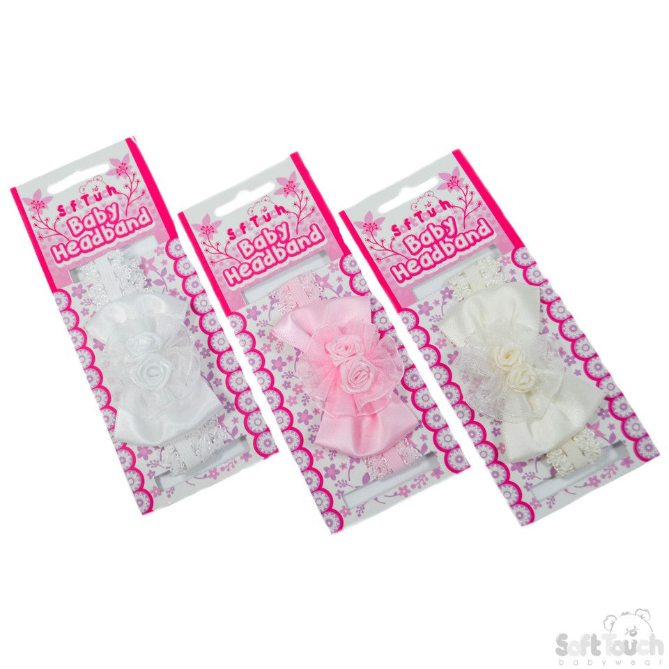 DESIGN/ COLOUR : 3 Assorted Colours w/Satin Bow, Organza Flower & Stitched Rose: Cream, Pink & White